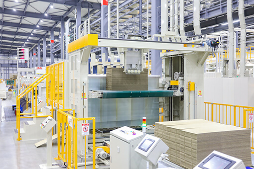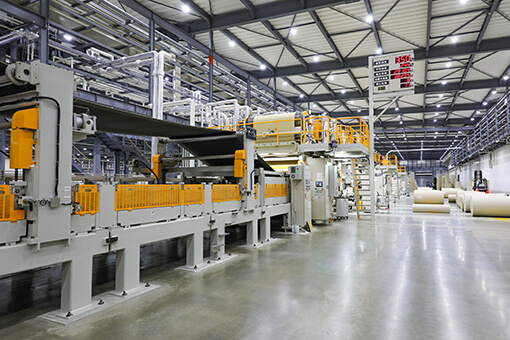 - 当社グループの世界最高速コルゲーターTM450の技術要素を100%取り入れた、TM350を導入しています。原紙を波型に成形し、表ライナ、裏ライナを貼り合わせて高精度、高強度の段ボールシートを作ります。