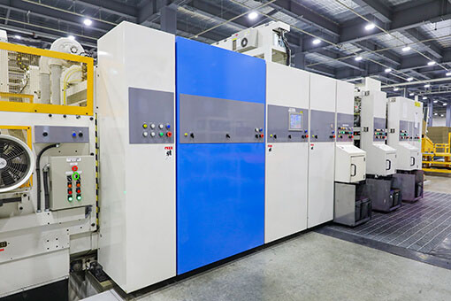 - 印刷と糊付を行いA式箱を作る装置です。シートサイズに関係なく常に安定した搬送によって高精度の印刷ができ、画像検査装置で品質を確認しています。